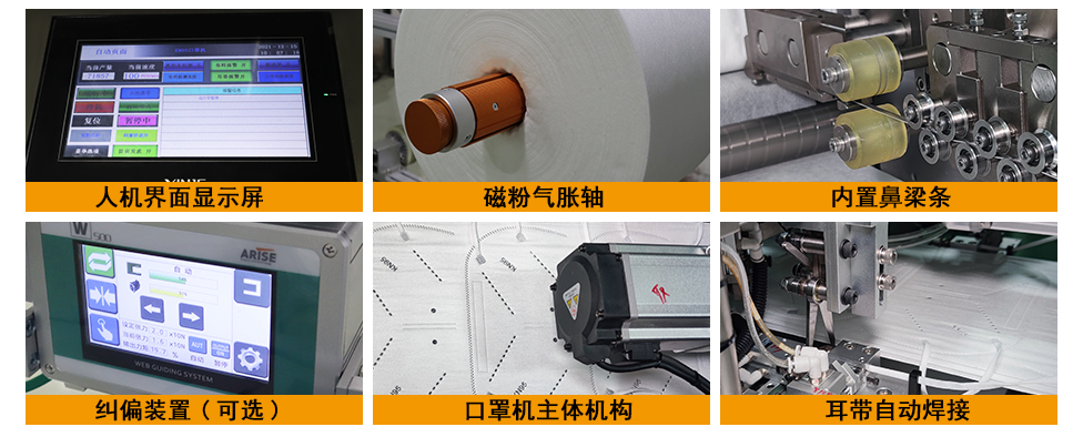 可根據(jù)生產(chǎn)工藝及市場需求自由選配生產(chǎn)3到6層KN95口罩。從 無紡布 ?口罩成型 ?口罩切斷分離 ? 口罩耳帶焊接 ?口罩成品獨立包裝 ?全自動完成。個性化人機界面,參數(shù)化速度控制,一鍵提速化繁為簡,操作簡單